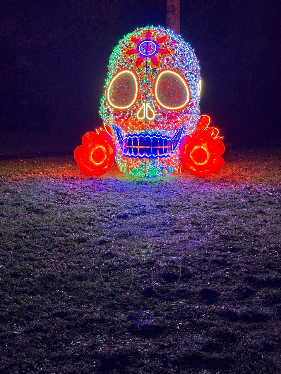 “Illuminated skull and floral light installation at GLOW Festival Eindhoven at night.”